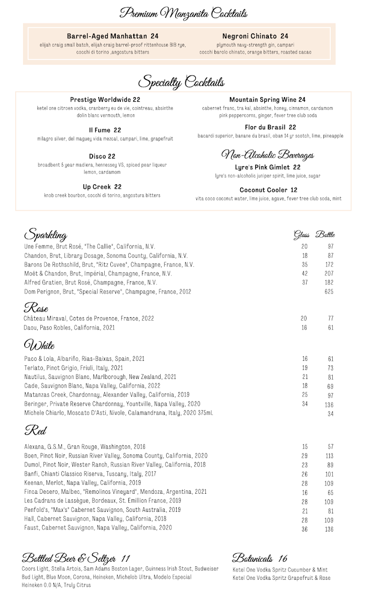 Nestled within The Ritz-Carlton, Lake Tahoe, Manzanita offers an extraordinary culinary experience that reflects Pacific-Northwest Mexican fusion. The menu is characterized by seasonal ingredients, ensuring freshness and creativity in every dish. Diners can savor exquisite options such as delicately prepared scallops paired with wood-fired carrots or a beautifully presented salmon wrapped in rice paper.